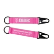 Тканинний брелок «АХІЛЛЕС» рожевого кольору з металевим кільцем для кріплення ключів. Брелок оснащений карабіном. Знак полку «АХІЛЛЕС» – золотий спис, який символізує прагнення до мети, враження цілі, першість на полі бою та у технологічному розвитку. Зображення спису нагадує смолоскип та знак нескінченності, що спрямований у небо.